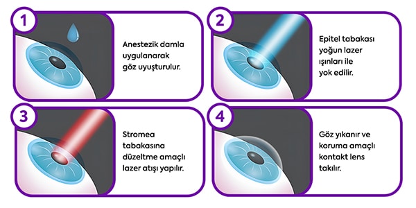• Ameliyat sonrasında koruma amaçlı yumuşak bir kontak lens yerleştirilmektedir. Sonrasında bu kontak lens korneanın iyileşme durumuna göre 4 ila 5 gün sonra alınmaktadır.