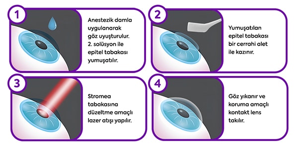 Aslında PRK Lazer Göz Ameliyatı yöntemi LASEK ile TransEpiteliyal (No-Touch) arası bir yöntemdir. Özellikle bu yönteminde ilk 2-3 gün orta şiddette ağrılı ve gün boyunca sulanma ve batma hissiyatı yaratır. Ameliyat sonrasında koruma amaçlı yumuşak bir kontak lens yerleştirilir. Sonrasında bu kontak lens korneanın iyileşme durumuna göre 4 ila 5 gün sonra alınır.